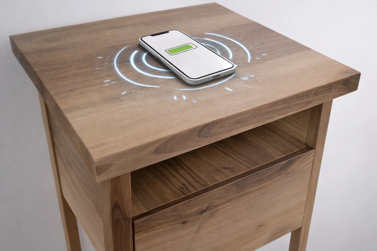 Het prototype heeft een Qi-laadoppervlak verwerkt in het blad, een dimbare LED-strip langs de onderkant (indirect licht, geen directe bron zichtbaar), en een stille lade zonder handvat — push-to-open. Het kastje staat op een stalen frame van 12 mm profiel.