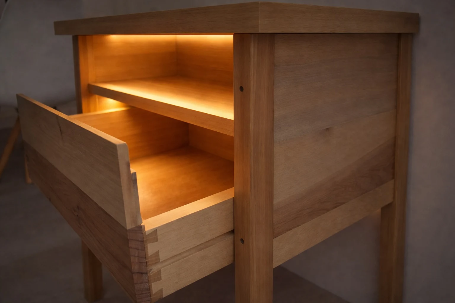 Een early-stage bedside system dat onderzoekt hoe dagelijkse technologie (opladen, verlichting, wekker) in een meubel kan verdwijnen zonder de sfeer te verstoren.