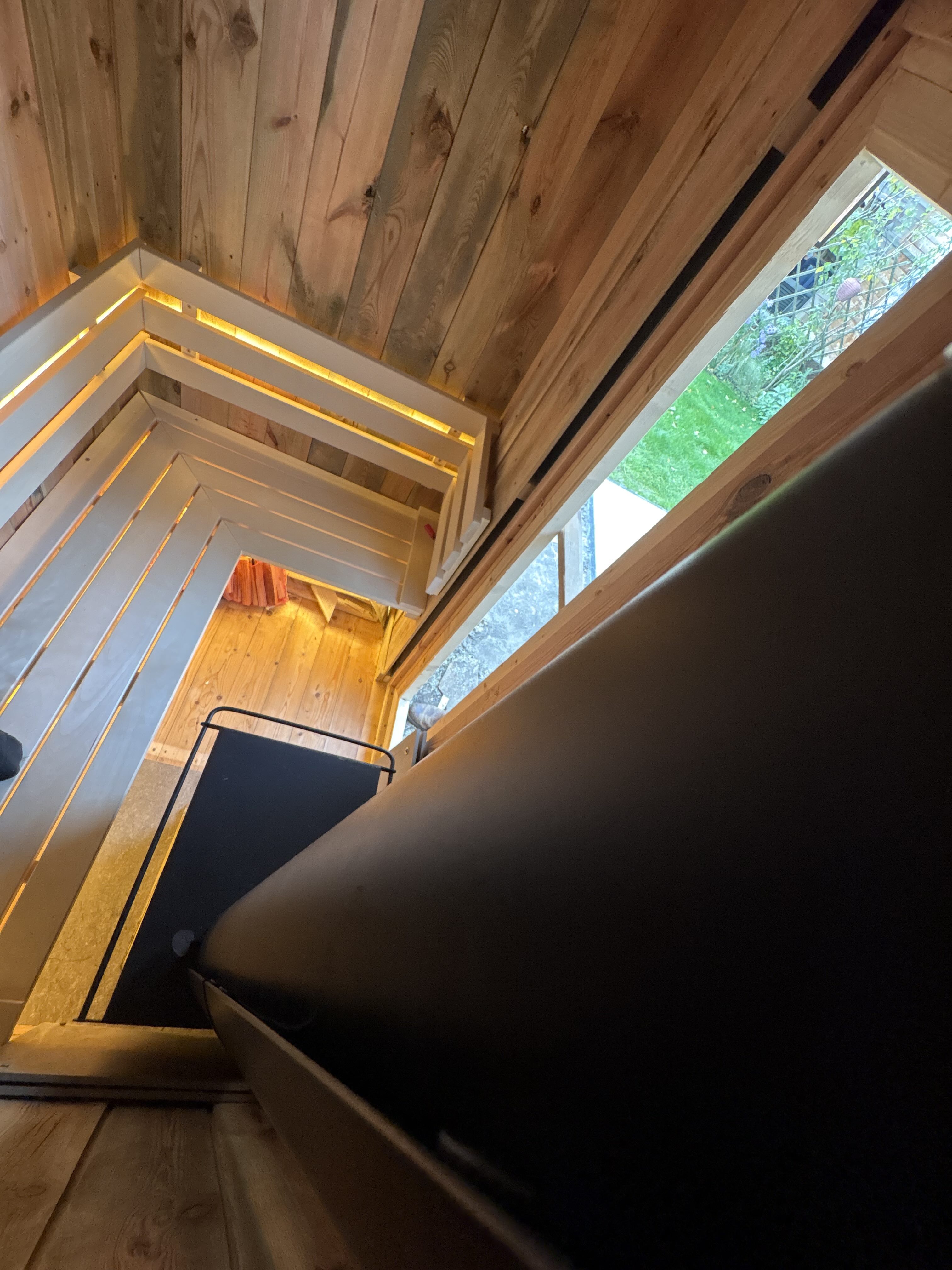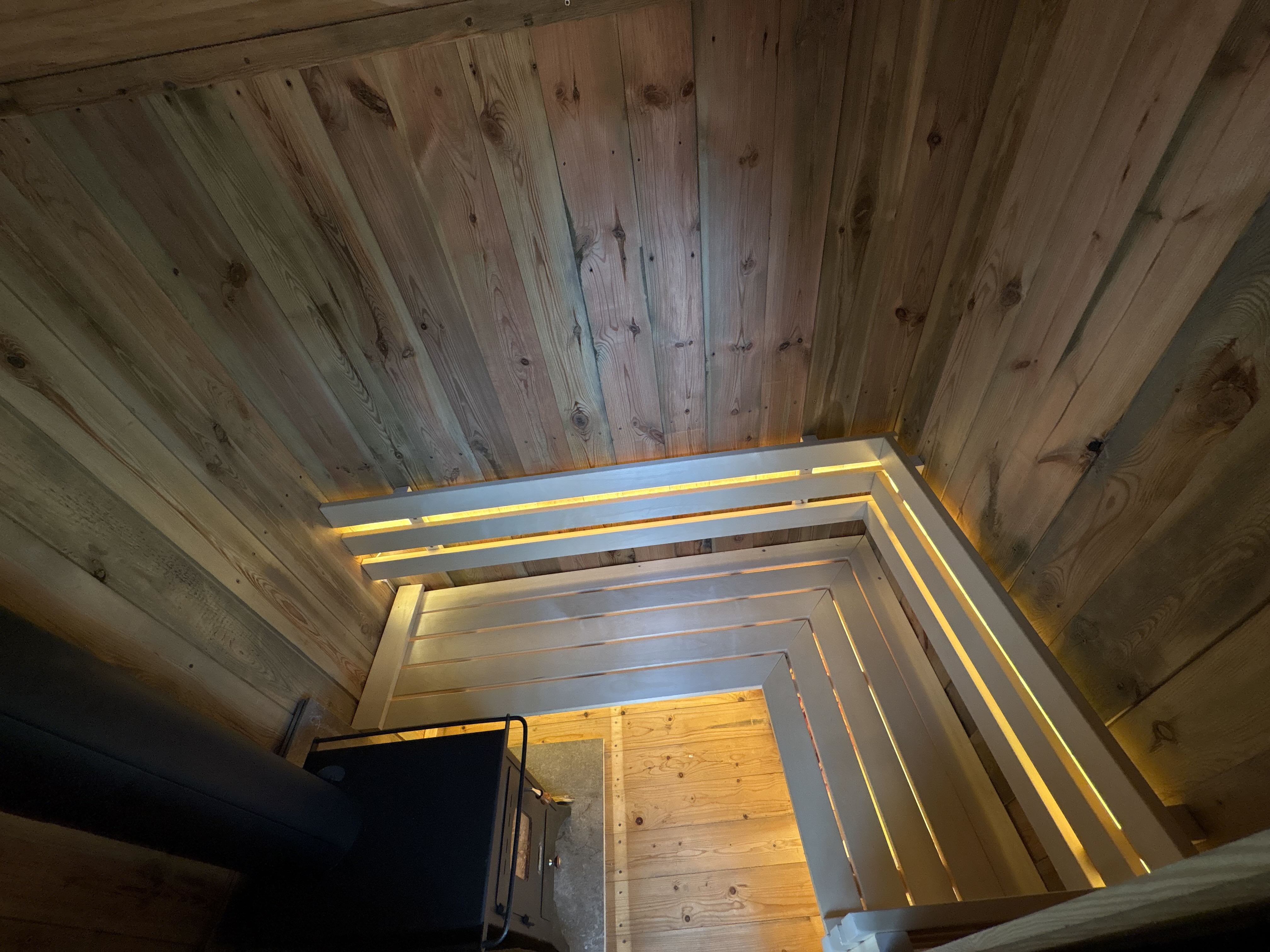 De ruimte is compact gehouden (ca. 2.00 × 1.60 m), waardoor efficiëntie en intimiteit samenkomen. De banken zijn opgebouwd uit espen latten en geïntegreerd in de constructie, met indirecte verlichting die de lijnen van het interieur volgt.