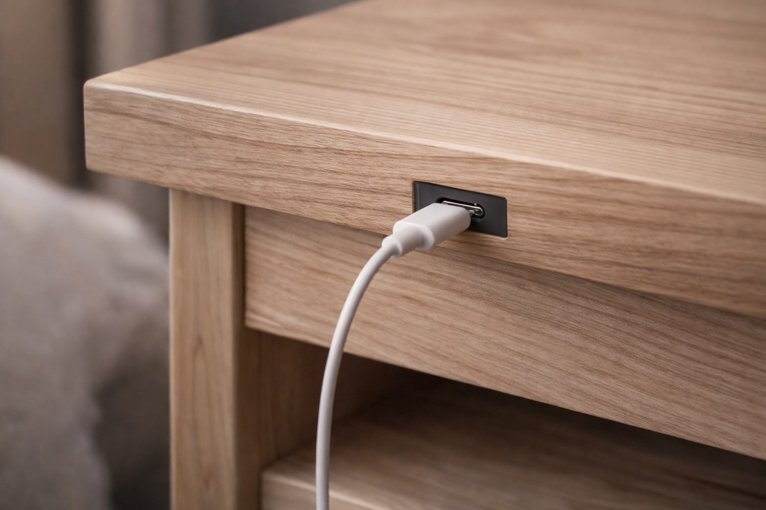 Prototype voor een slim nachtkastje met draadloos laden, sfeerverlichting en stil opbergen.