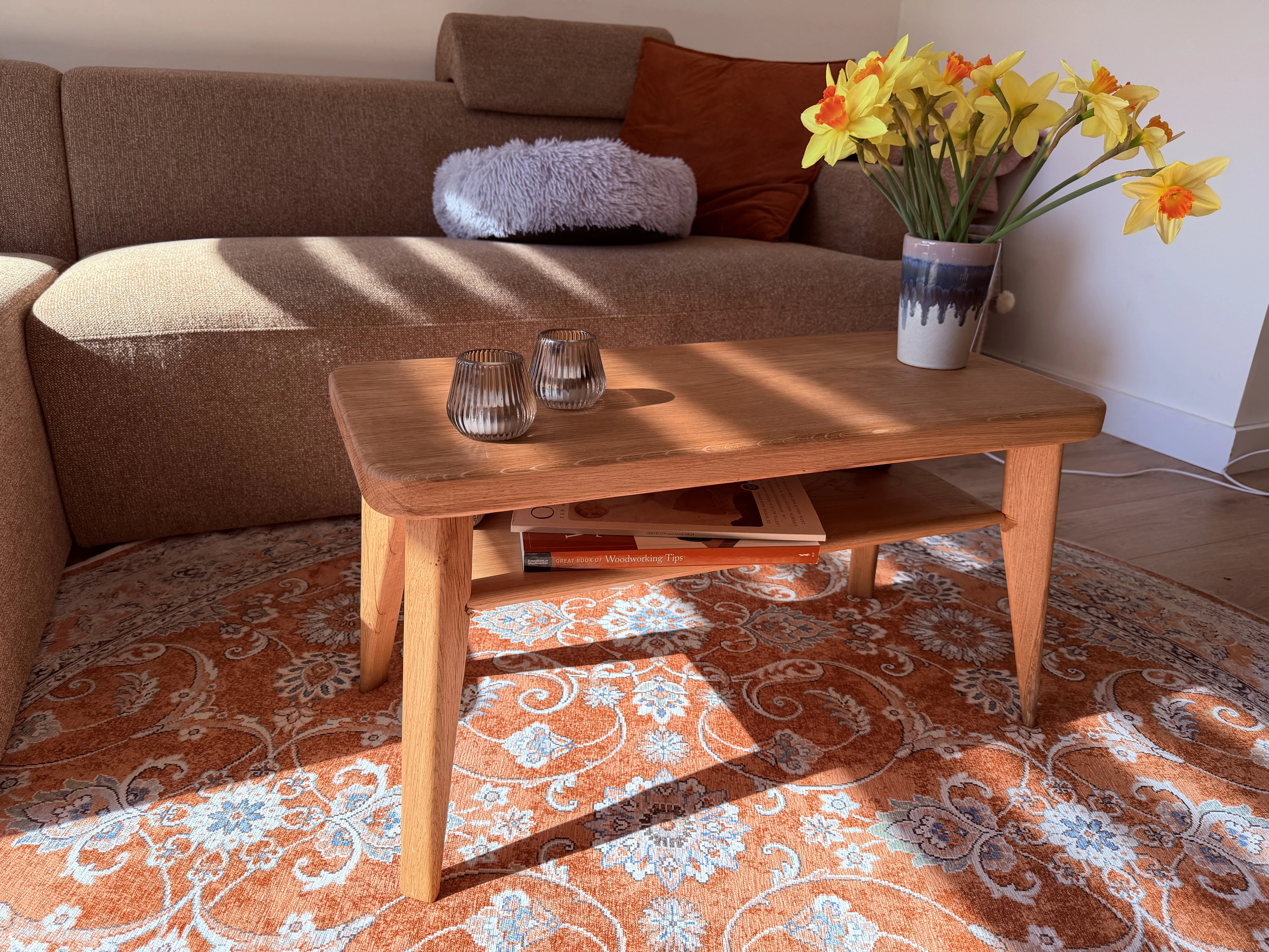 Een handgemaakte salontafel van massief eiken met afgeronde hoeken, taps toelopende poten en een open onderplank. Ontworpen om warmte, rust en subtiele functionaliteit aan de leefruimte toe te voegen.