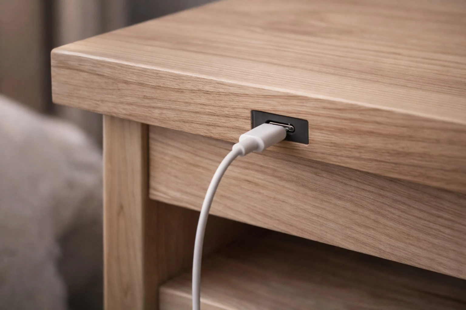 Een early-stage bedside system dat onderzoekt hoe dagelijkse technologie (opladen, verlichting, wekker) in een meubel kan verdwijnen zonder de sfeer te verstoren.