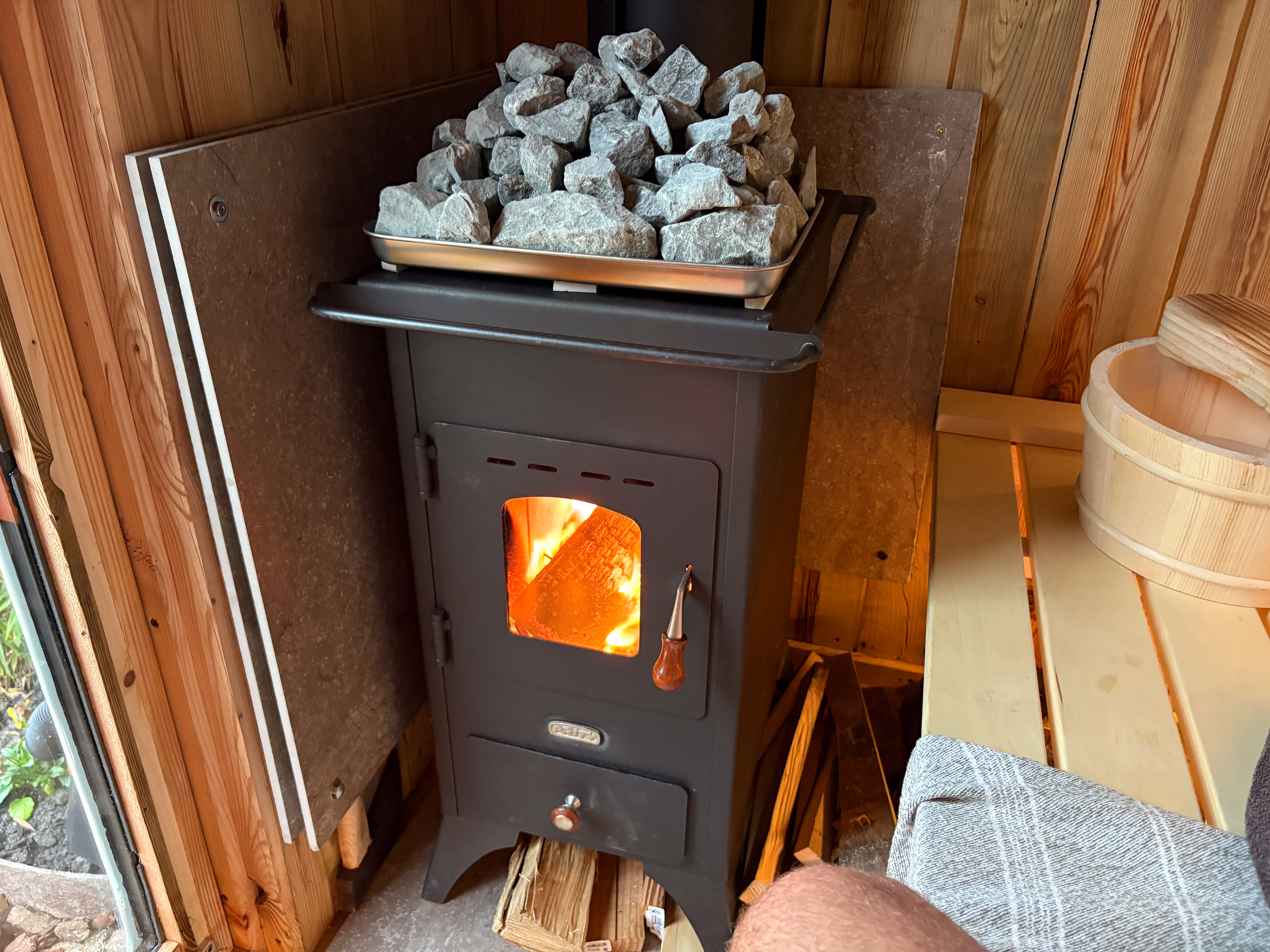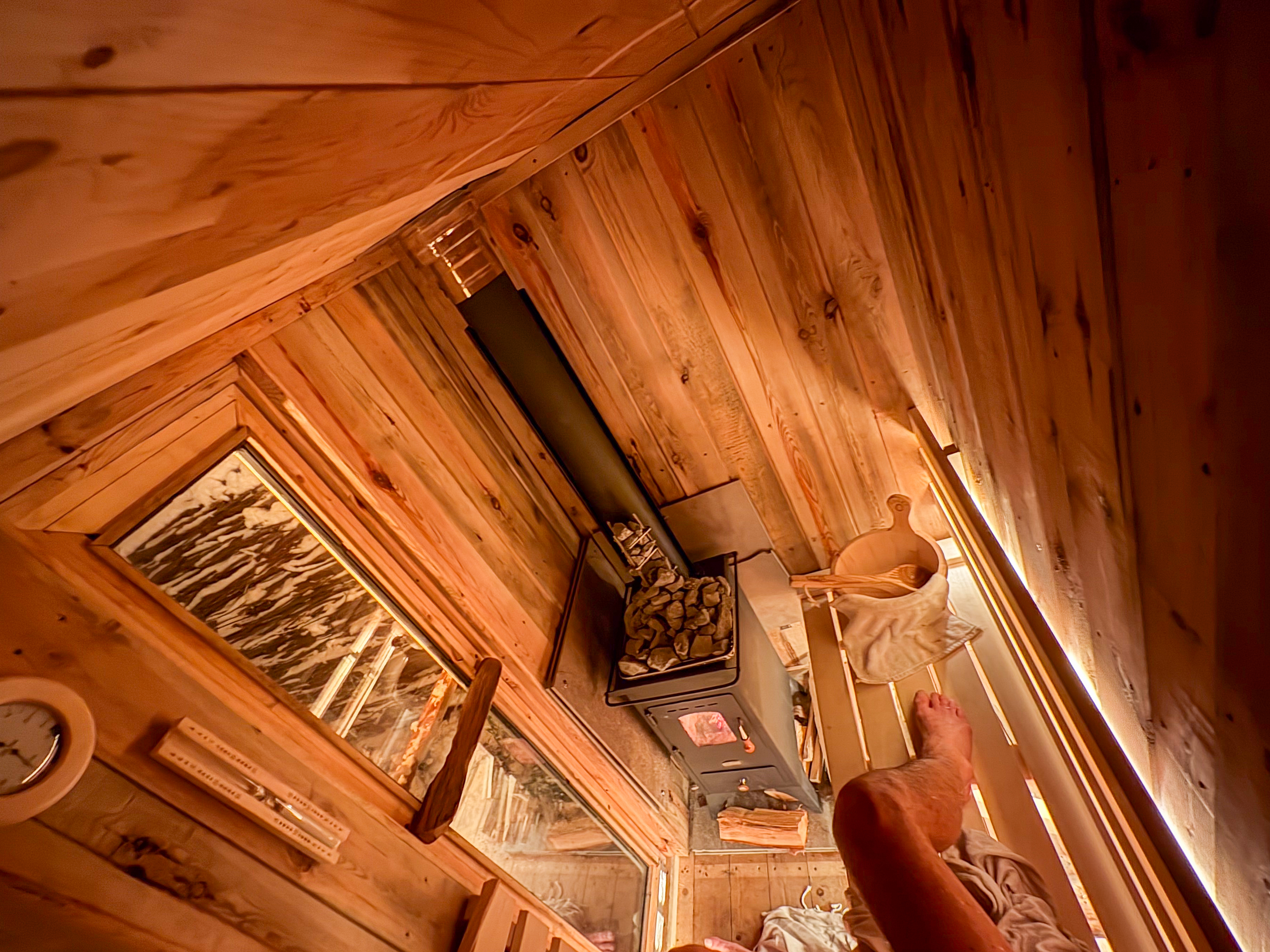 Centraal staat een houtgestookte kachel (±5 kW), die niet alleen warmte genereert, maar ook ritme en aanwezigheid vraagt. Het stoken, het wachten, het opbouwen van temperatuur — het zijn bewuste handelingen die de ervaring bepalen.